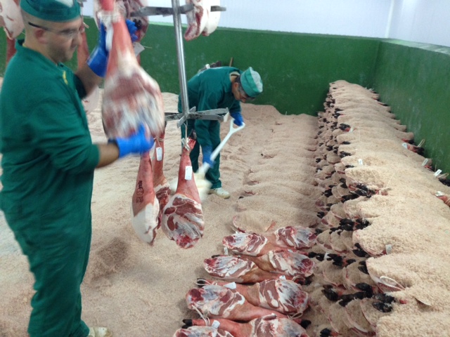 El primer paso para la elaboración de una pieza de jamón es la refrigeración.Una vez que se reciben los jamones se almacena en cámaras, a la salida se someten a un masaje para eliminar cualquier resto de sangre de los vasos sanguíneos.